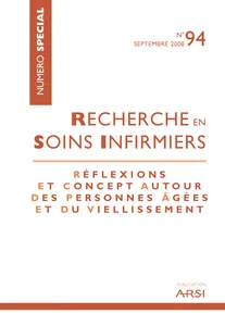 Réflexions et concept autour des personnes âgées et du vieillissement N° 94, 2008/3 - pagesPages 3 à 3Mieux comprendre les phénomènes du vieillissementPar Monique FormarierPages 4 à 27Vieillir : mieux comprendre pour mieux agirPar Claude LafonPages 28 à 41Vieillir au grand âgePar Vincent CaradecPages 42 à 55L'humanitude dans les soinsPar Yves Gineste, Rosette Marescotti, Jérôme PellissierPages 56 à 62Les politiques de la vieillesse face aux questions éthiquesPar Éric FiatPages 63 à 69L'usage de l'enfance face à la maladie d'Alzheimer : du retour au recoursPar Cédric HumbertPages 70 à 79Familles et professionnels en gérontologie : quelles difficultés ? Quelle place pour chacun ?Par Claudine Badey-RodriguezPages 80 à 91Le relogement en centre d'hébergement d'un conjoint atteint de problèmes cognitifs : l'expérience des épousesPar Anne-Marise Lavoie, Sylvie Lapierre, Monique BenoitPages 92 à 100Soins esthétiques aux personnes âgées dans la réhabilitation hospitalièrePar Marie-Hélène Tarteaut, François Herrmann, Raphaël Grandjean, Laurence Toutous-Trellu
